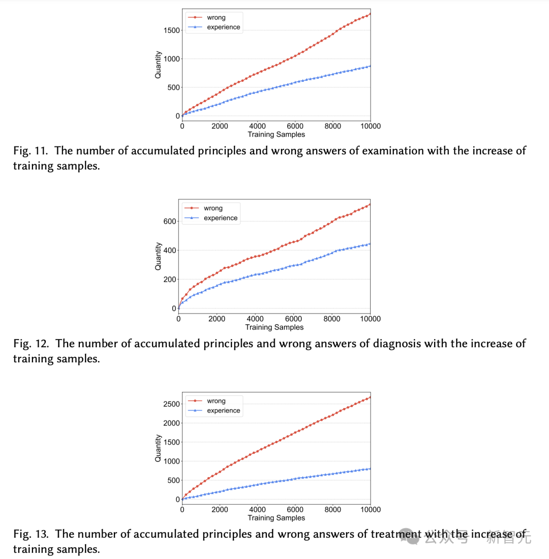 在经验积累上,图11、图12和图13分别显示了,检查、诊断和治疗任务中,经过验证经验和错误答案的积累。