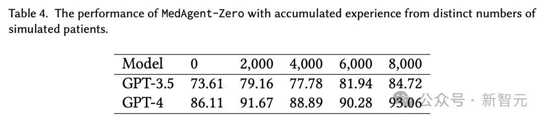 无论是使用GPT-3.5还是 GPT-4,使用8000个病例积累的经验库,其性能都高于使用2000/4000/6000个病例的性能。