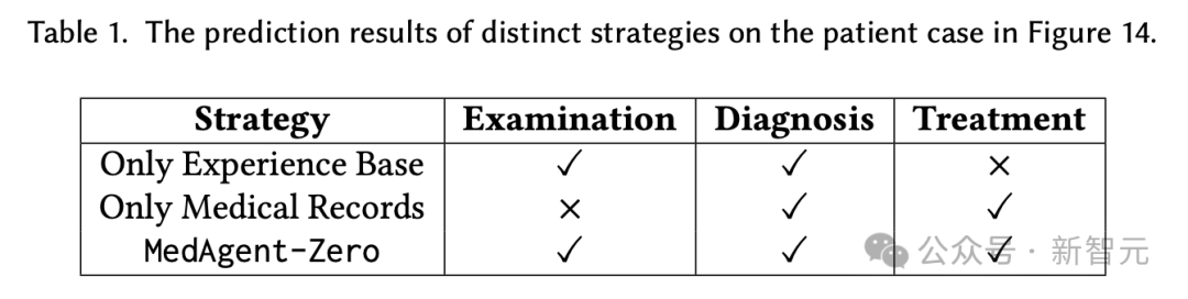 下表中说明了,经验库、病理库和MedAgent-Zero,在患者诊疗中的三个任务上的性能。