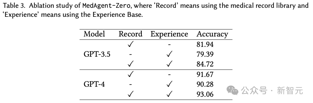 同时利用「病历库」和「经验库」的MedAgent-Zero取得了最佳性能,表明这两个模块对诊断的帮助。