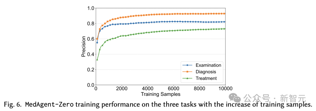 在检查、诊断、治疗三个任务方面上的性能,MedAgent-Zero也随着样本增加,不断波动,但整体准确性呈现出上升趋势。