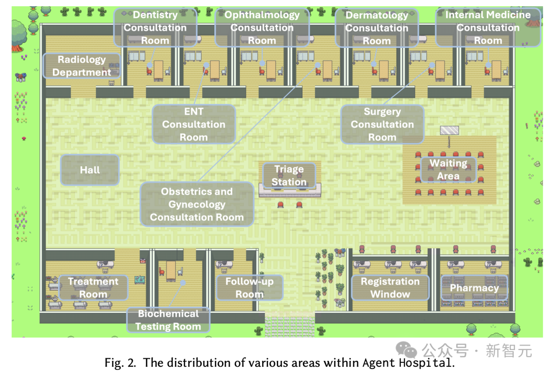 下图中展示的是,Agent Hospital内有各种问诊室和检查室,因此需要一系列医疗专业智能体工作。