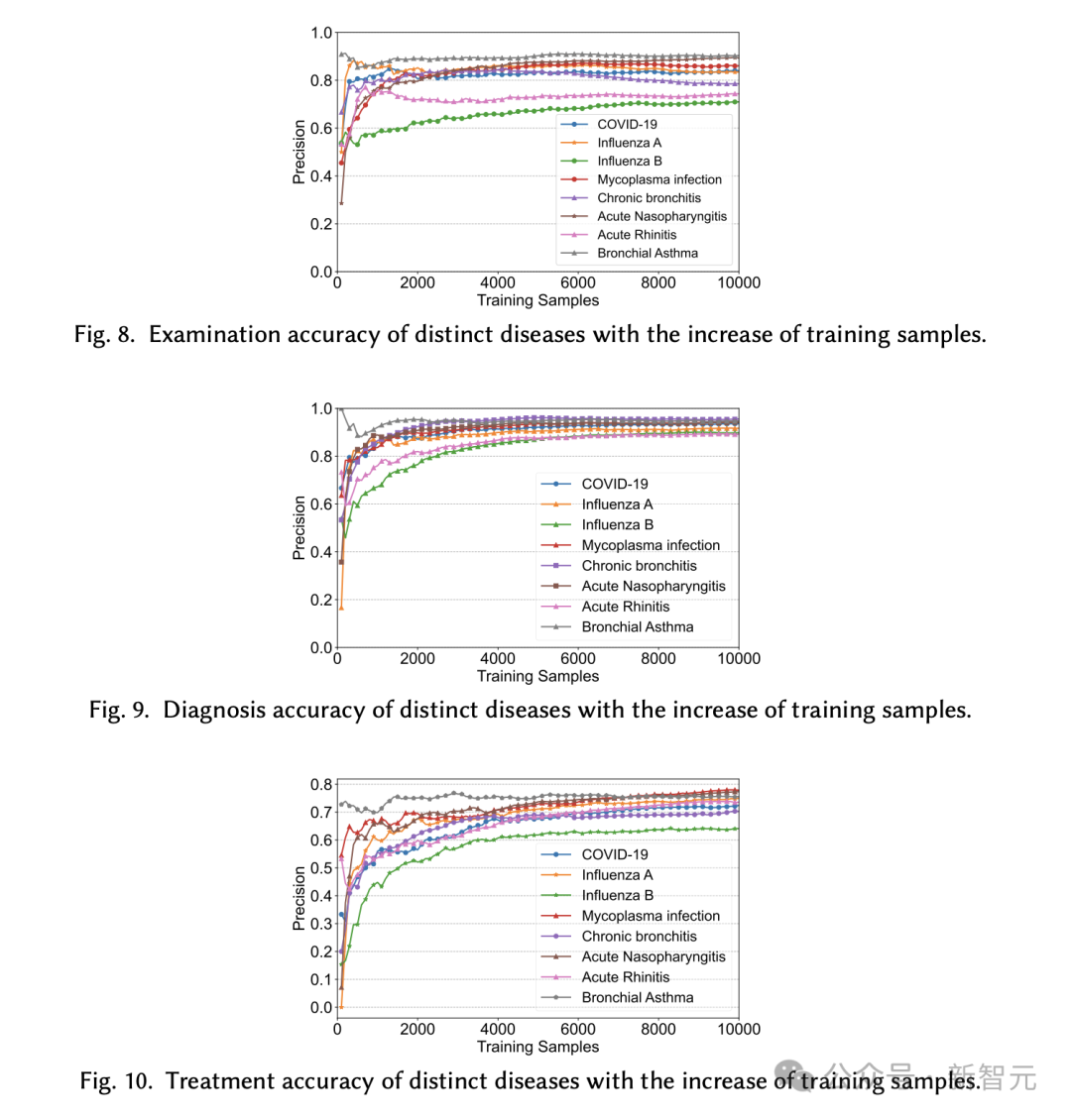 再看如下三张图,分别展示了不同疾病的检查精度、诊断精确度、以及治疗精度,随着样本的增加,也在平稳攀升。