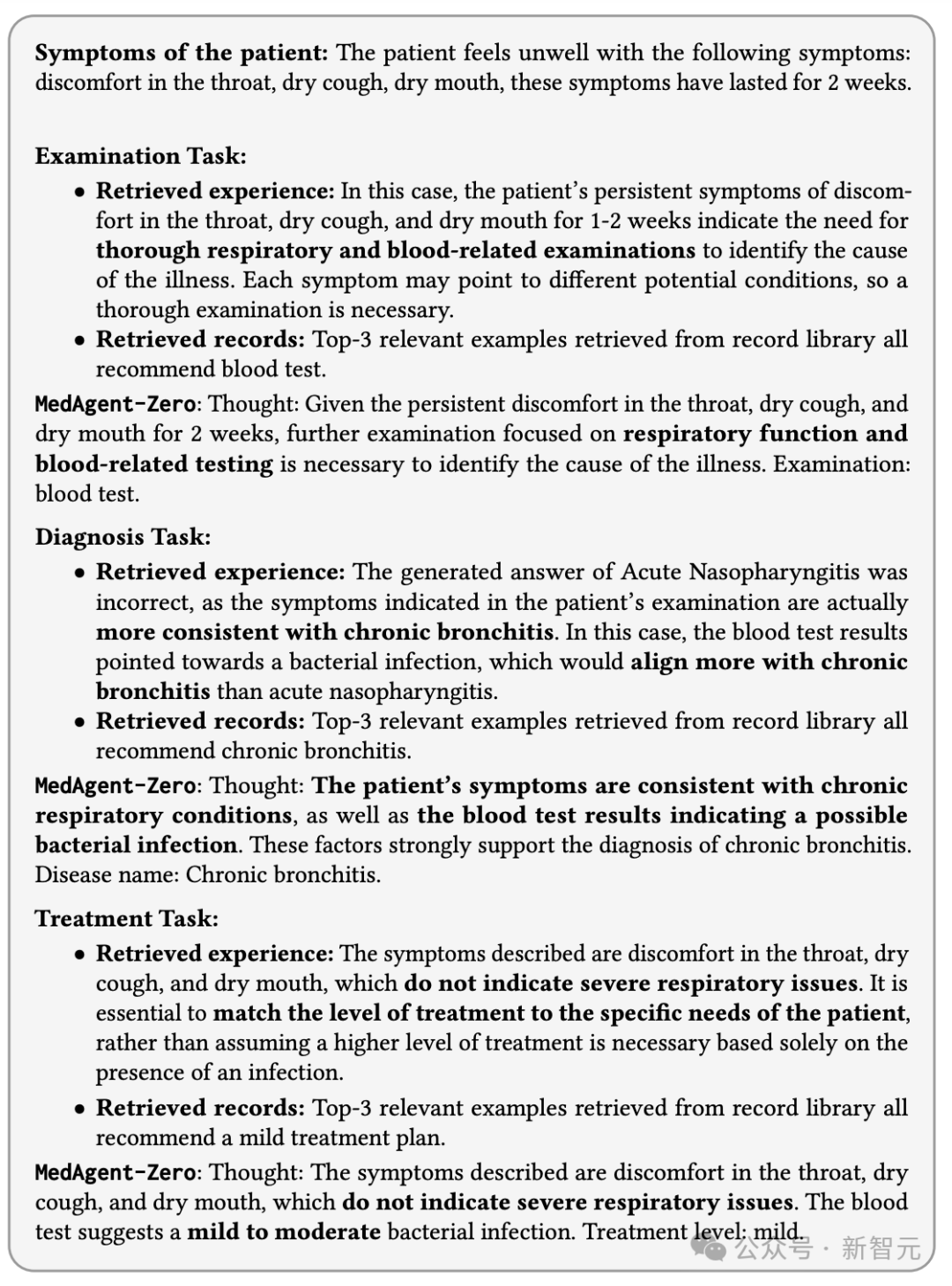 如下,通过添加经验和记录,MedAgent-Zero针对所有3个任务都给出了正确的回答。