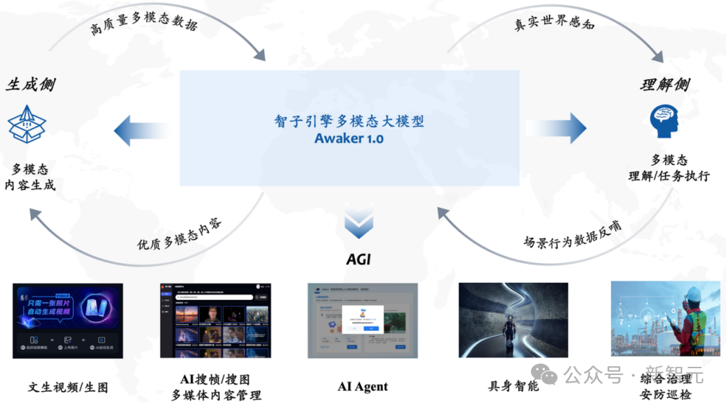 在理解侧,Awaker 1.0与数字世界和现实世界进行交互,在执行任务的过程中将场景行为数据反哺给模型,以实现持续更新与训练;在生成侧,Awaker 1.0可以生成高质量的多模态内容,对现实世界进行模拟,为理解侧模型提供更多的训练数据。