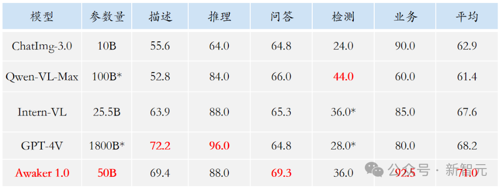 可以看到,Awaker 1.0的基座模型在视觉问答和业务应用任务上超过了GPT-4V、Qwen-VL-Max和Intern-VL,同时它在描述、推理和检测任务上也达到了次好的效果。