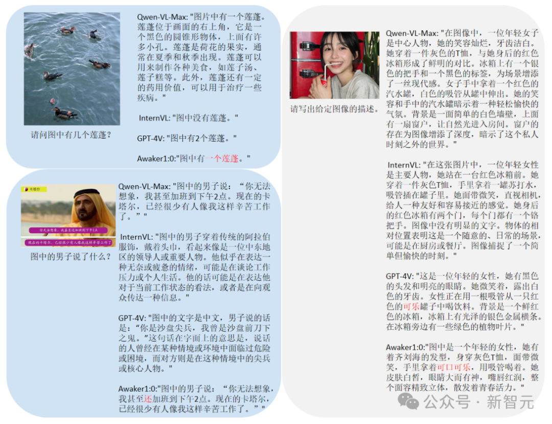 从这些对比例子可以看到,在计数和OCR问题上,Awaker 1.0能正确地给出答案,而其它三个模型均回答错误(或部分错误)。