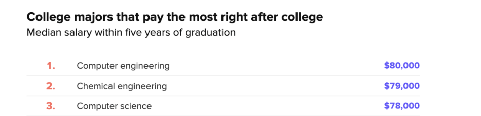 计算机工程排名第一,中位数达到8万美元。计算机科学排第三,中位数达到78000美元。