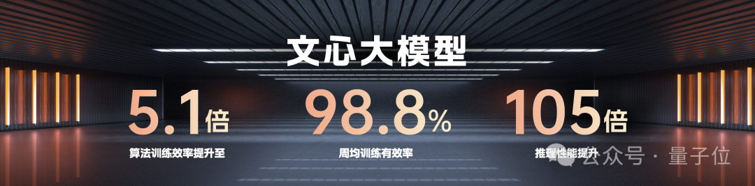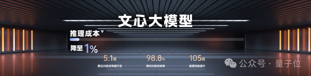 不仅如此,相比一年前,文心大模型的算法训练效率提升到了原来的5.1倍,周均训练有效率达到98.8%,推理性能提升了105倍,推理的成本降到了原来的1%。
