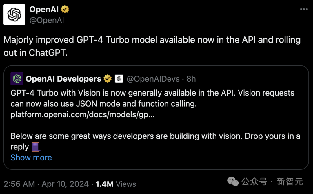 OpenAI今天官宣称,配备视觉能力的GPT-4 Turbo已经可以通过API调用了。