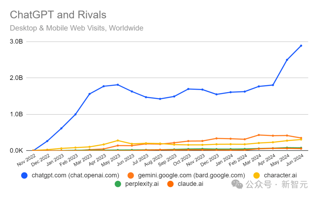 据Similarweb估计,ChatGPT在2024年6月创下了新的访问者记录。网站当月记录了29亿次访问量,比之前2024年5月的25亿次访问量记录增长了15.6%。