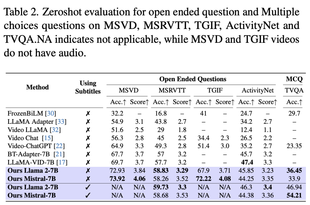带字幕和不带字幕的结果进一步表明,将字幕信息与视觉提示集成可显著提高性能,TVQA的准确率从33.9%提高到54.21%。