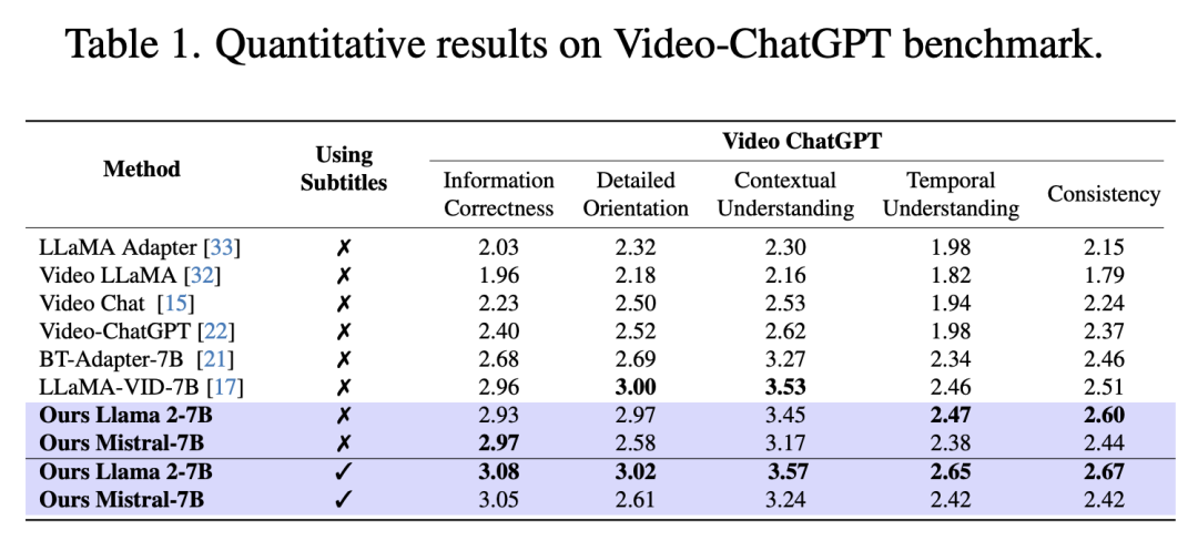表1所示的VideoChatGPT基准测试中,最新模型在没有字幕的情况下与之前的方法不相上下。