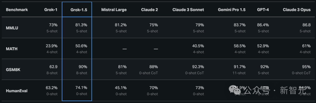 在测试中,Grok-1.5在数学基准上取得50.6%的得分,在GSM8K基准上获得了90%,这两个数学基准涵盖了从小学到高中的各种竞赛问题。