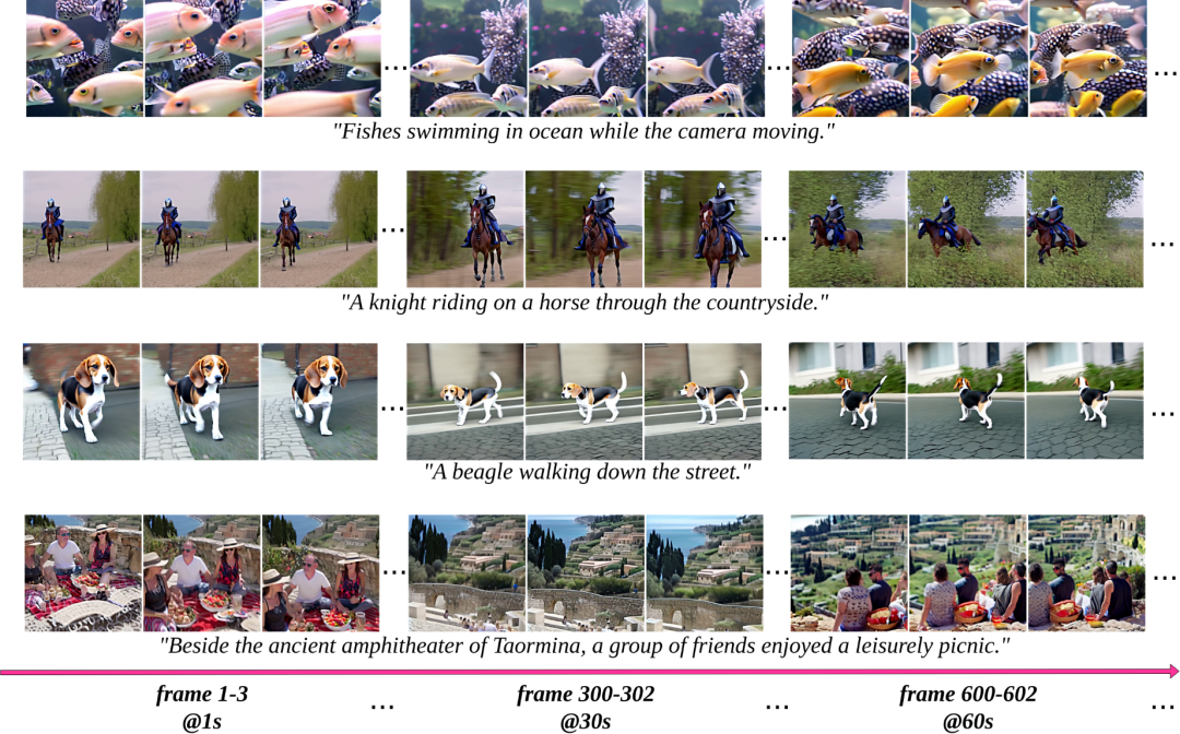 具体来说,StreamingT2V可以生成1200帧甚至理论上无限长的长视频,并且能保证视频内容过渡非常自然平滑,内容丰富多样。
