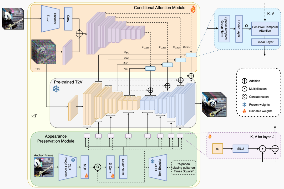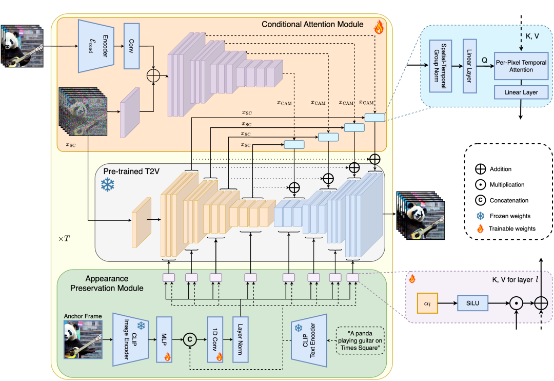 首先,条件注意力模块(CAM)充当短期记忆,它通过一个特殊的编码器分析前一个视频片段,确保视频的连续性和流畅过渡。这个机制特别适用于动作频繁的视频,使得视频看起来更加自然流畅。