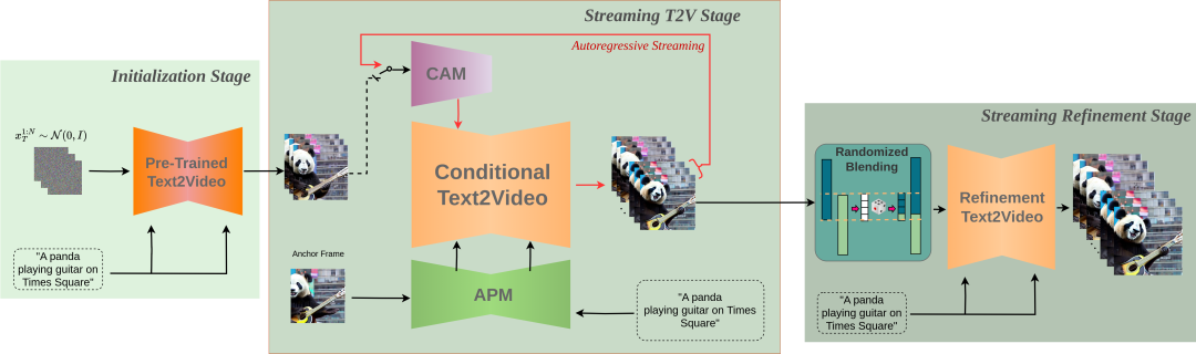 StreamingT2V技术的工作流程可以分为三个主要阶段。
