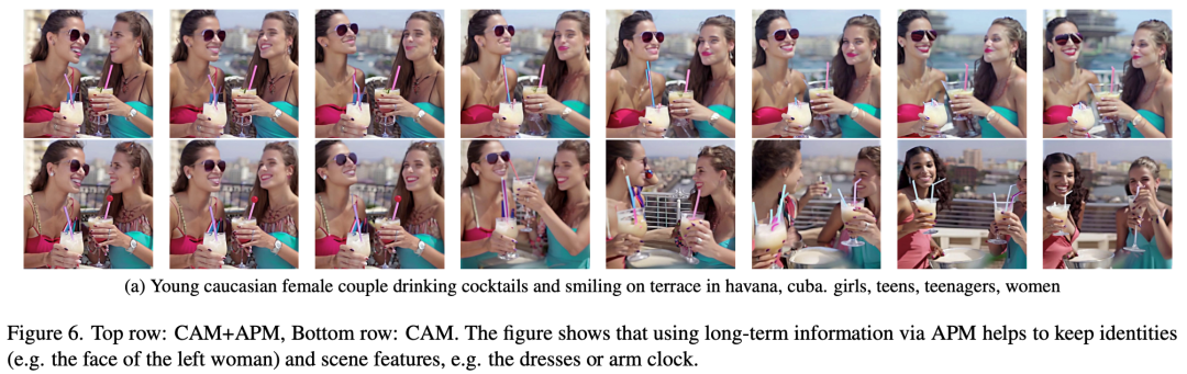 为了解决这个问题,研究人员利用研究人员提出的「外观保存模块」(Appearance Preservation Module,APM),通过利用第一个片段的固定锚帧所包含的信息,将长期记忆纳入其中。这有助于在各代视频块中保持场景和物体特征(见下图6)。