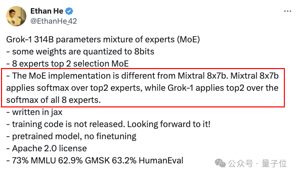除了Gao,还有英伟达AI科学家Ethan He(何宜晖)指出,在专家系统的处理方面,Grok也与另一知名开源MoE模型Mixtral不同——
