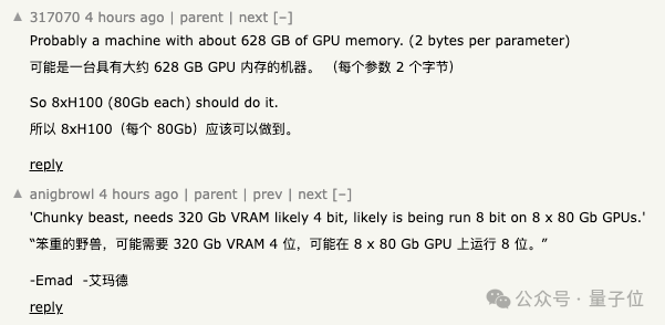 而且这个“足够的GPU”,要求不是一般的高——YC上有网友推测,如果是8bit量化的话,可能需要8块H100。