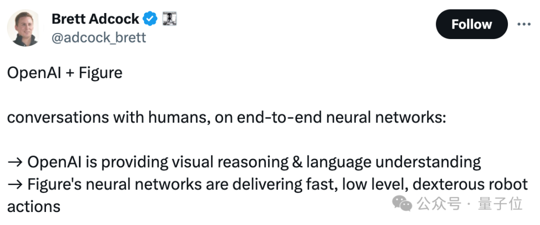 根据创始人的介绍,Figure 01通过端到端神经网络,可以和人类自如对话。