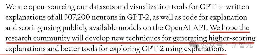 现在,OpenAI正在开源「用GPT-4来解释GPT-2中全部307,200个神经元」结果的数据集和可视化工具,也通过OpenAI API公开了市面上现有模型的解释和评分的代码,并且呼吁学界开发出更好的技术,产生得分更高的解释。