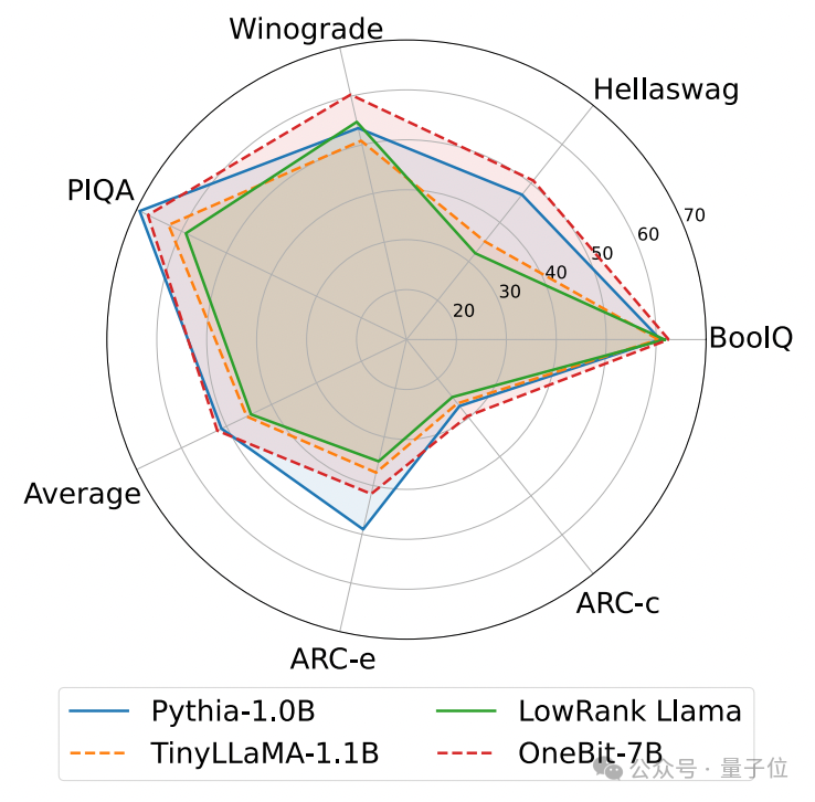 作者发现,尽管OneBit-7B平均位宽最小、占用的空间最小、训练的步数也相对少,但它在常识推理能力上不逊于其他模型。