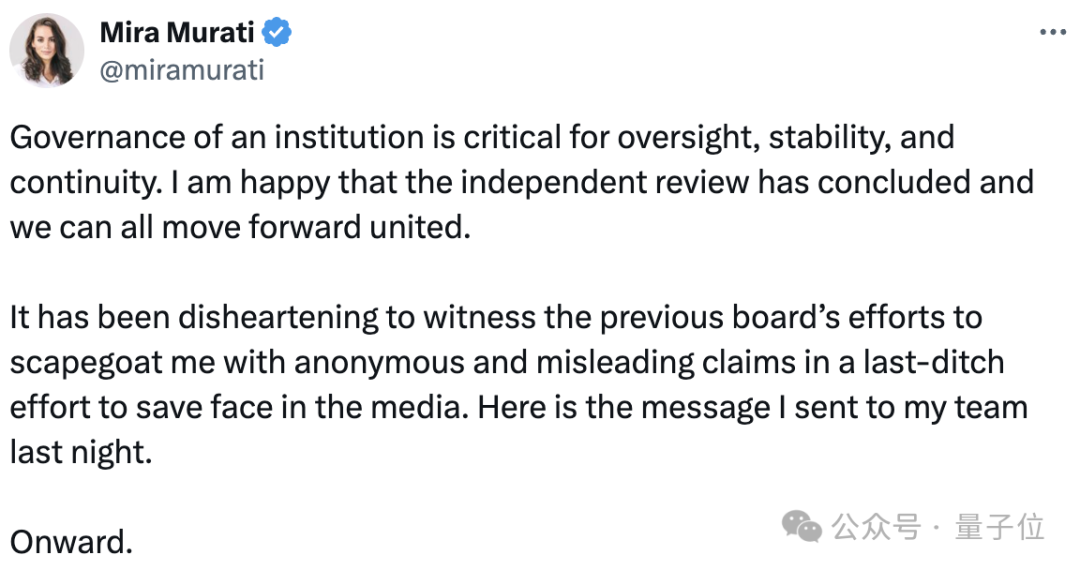不过就在刚刚,Mira发布推文驳斥了这一说法,表示这是前任董事会为了面子把自己推出来当替罪羊,对前董事会的这一举动感到“非常沮丧”。