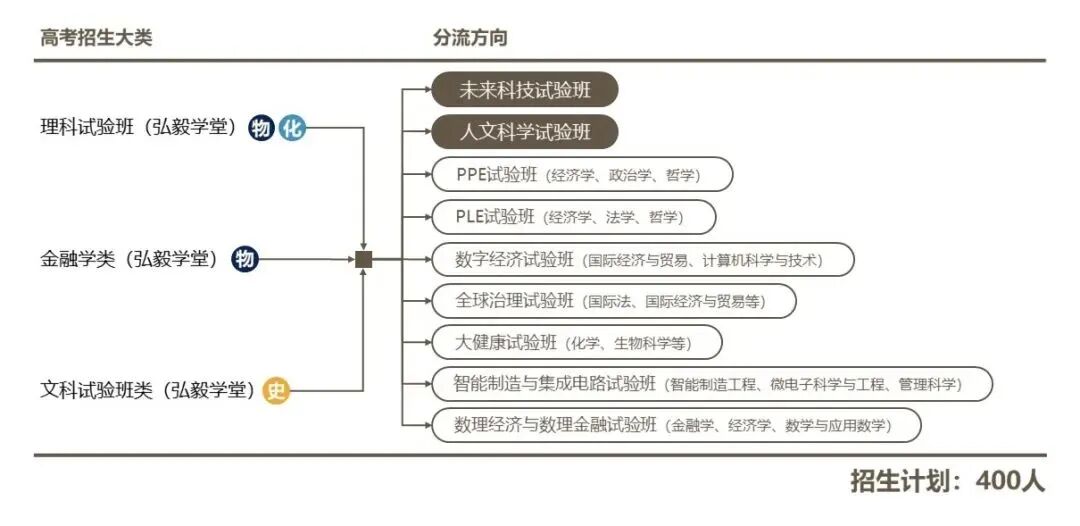 招生人数从245人增加到400人;9个试验班,分别是PPE试验班、PLE试验班、数字经济试验班、数理经济与数理金融试验班、全球治理试验班、大健康试验班、智能制造与集成电路试验班、未来科技试验班、人文科学试验班。新生进校后9个试验班任选,部分学生全校专业任选。