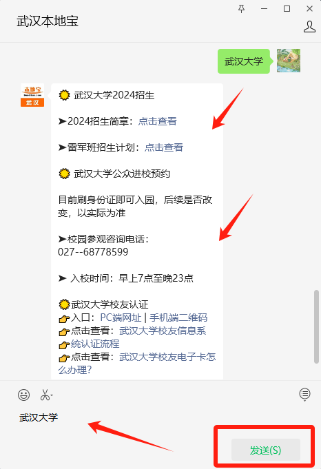 在微信聊天对话框回复【武汉大学】即可获取相关信息