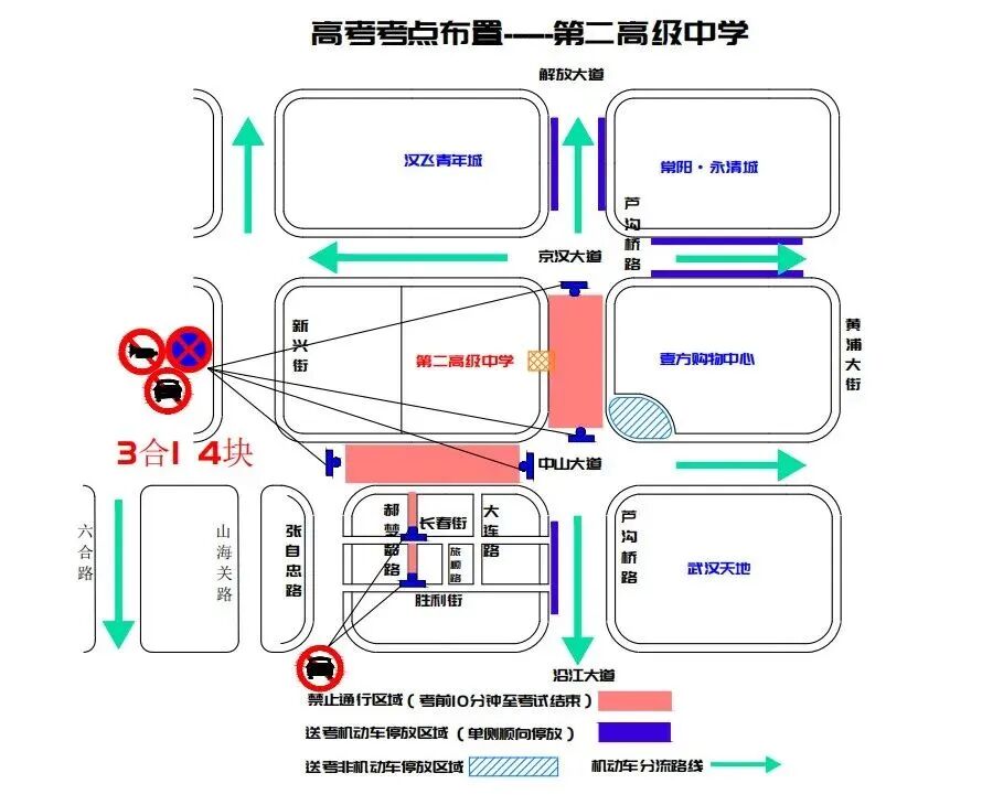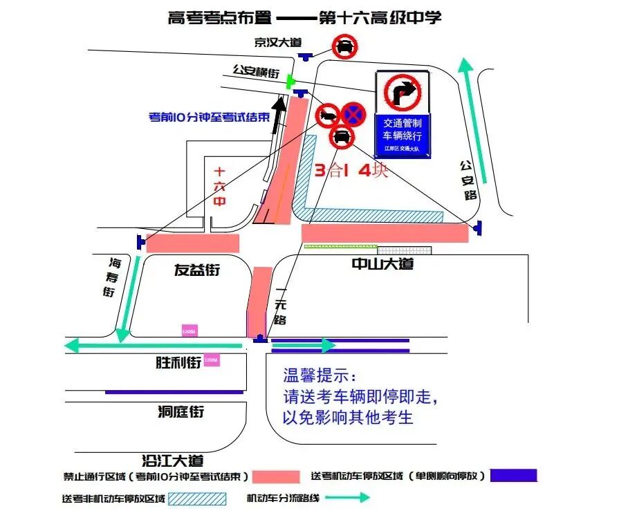一元路(公安横街至胜利街)、中山大道(海寿街至公安路)每日考前十分钟至考试结束禁止通行,建议绕行京汉大道、沿江大道、胜利街、公安路;一元路胜利街路口、中山大道海寿街口禁停、禁鸣、禁行。