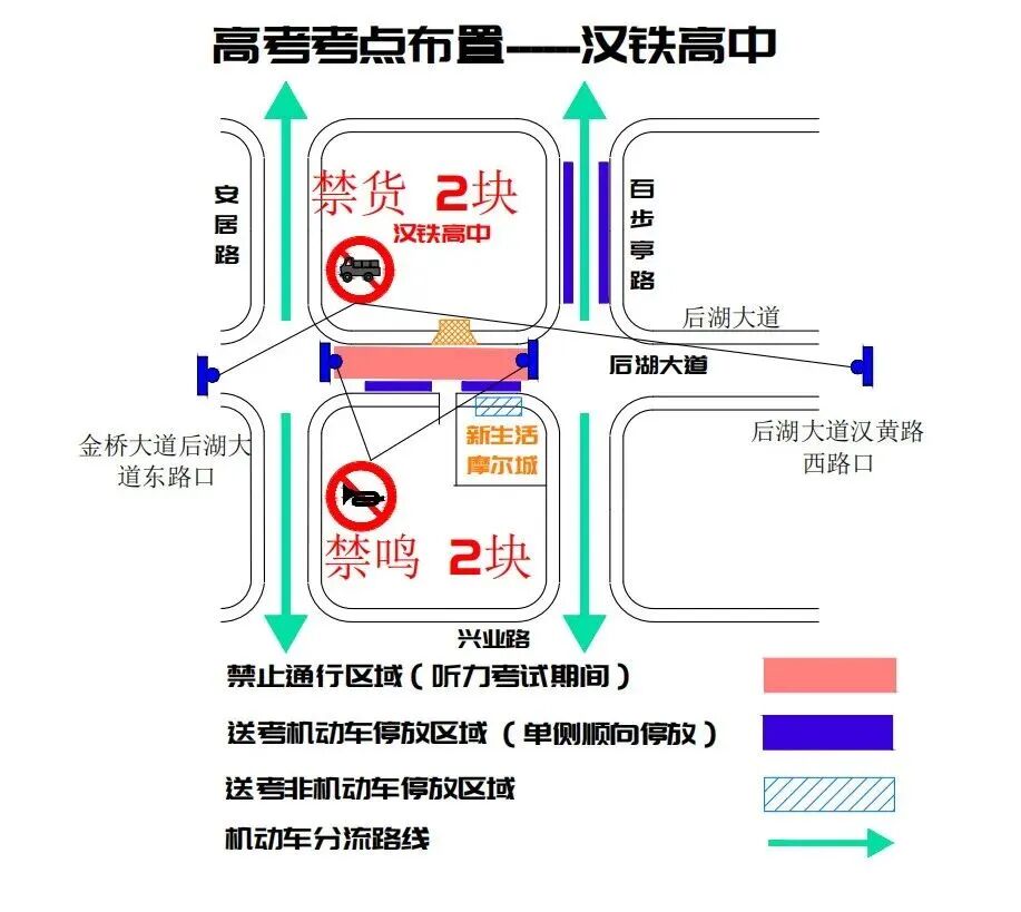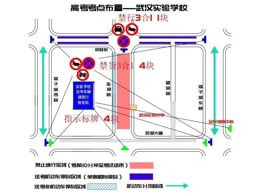 连湖路(秋桂街至后湖大道)每日考前十分钟至考试结束禁止通行,建议按指示标牌绕行塔子湖东路、塔子湖西路。