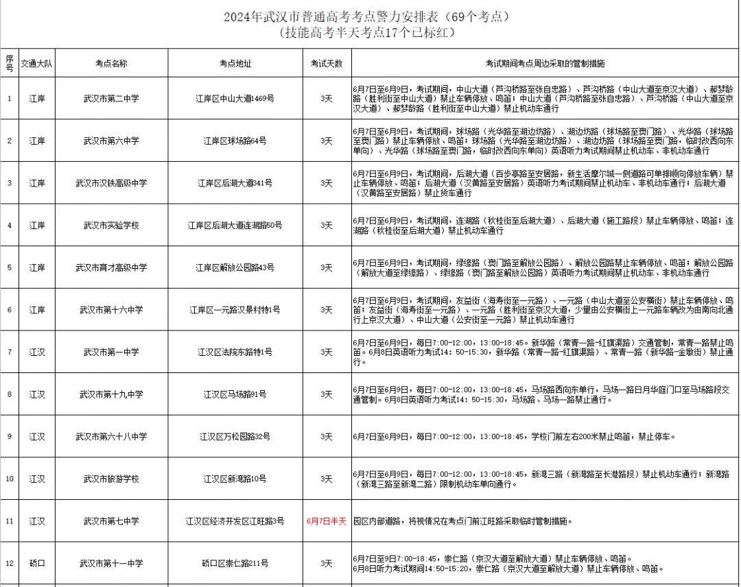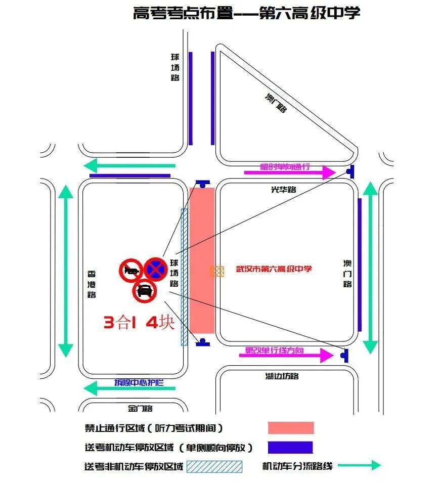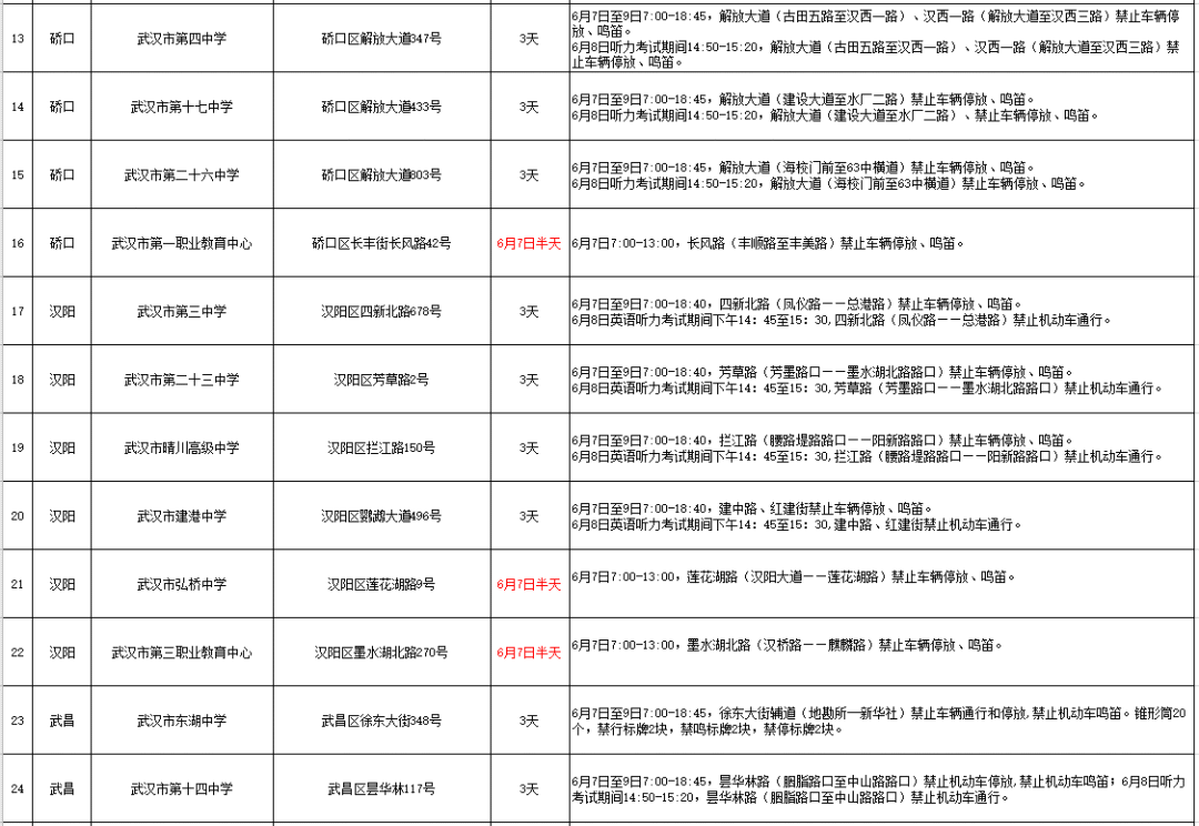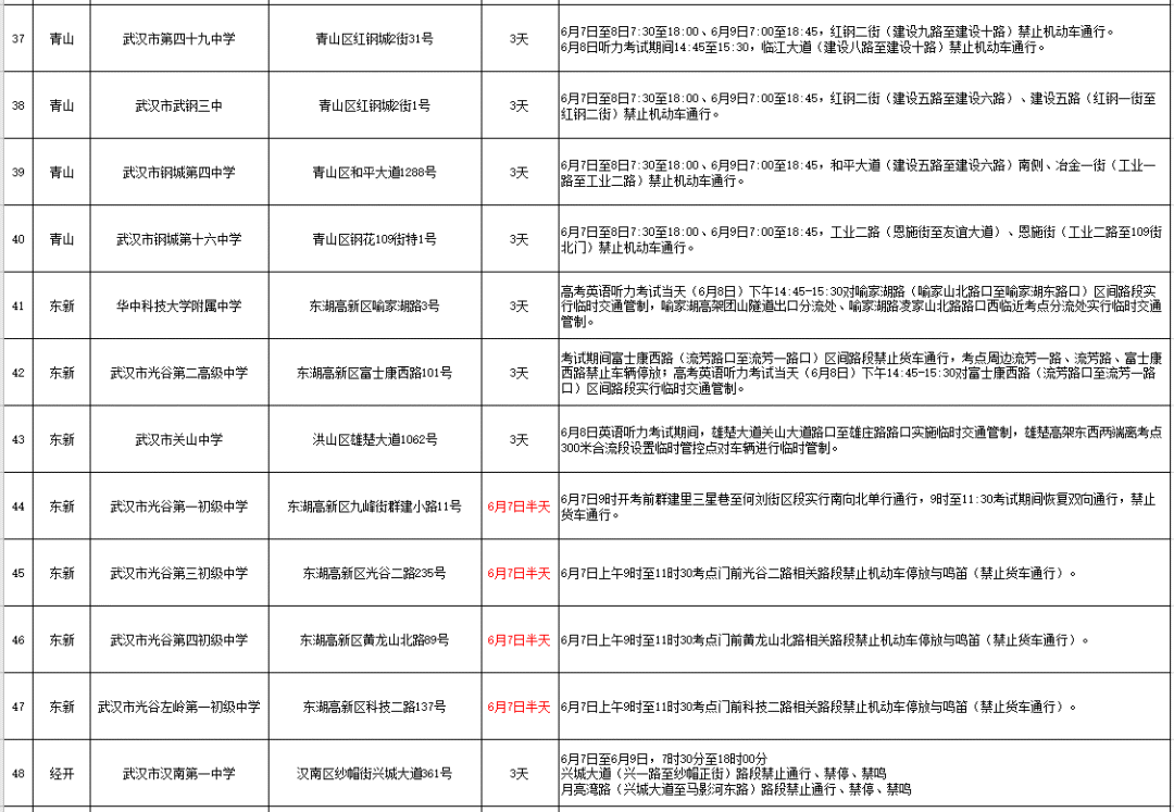 6月7日—9日每日上午考试前2小时至当日考试结束,考点门前武珞路辅道、非机动车道禁止通行。