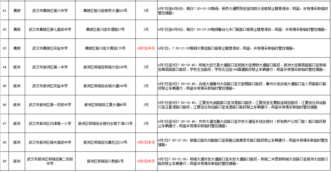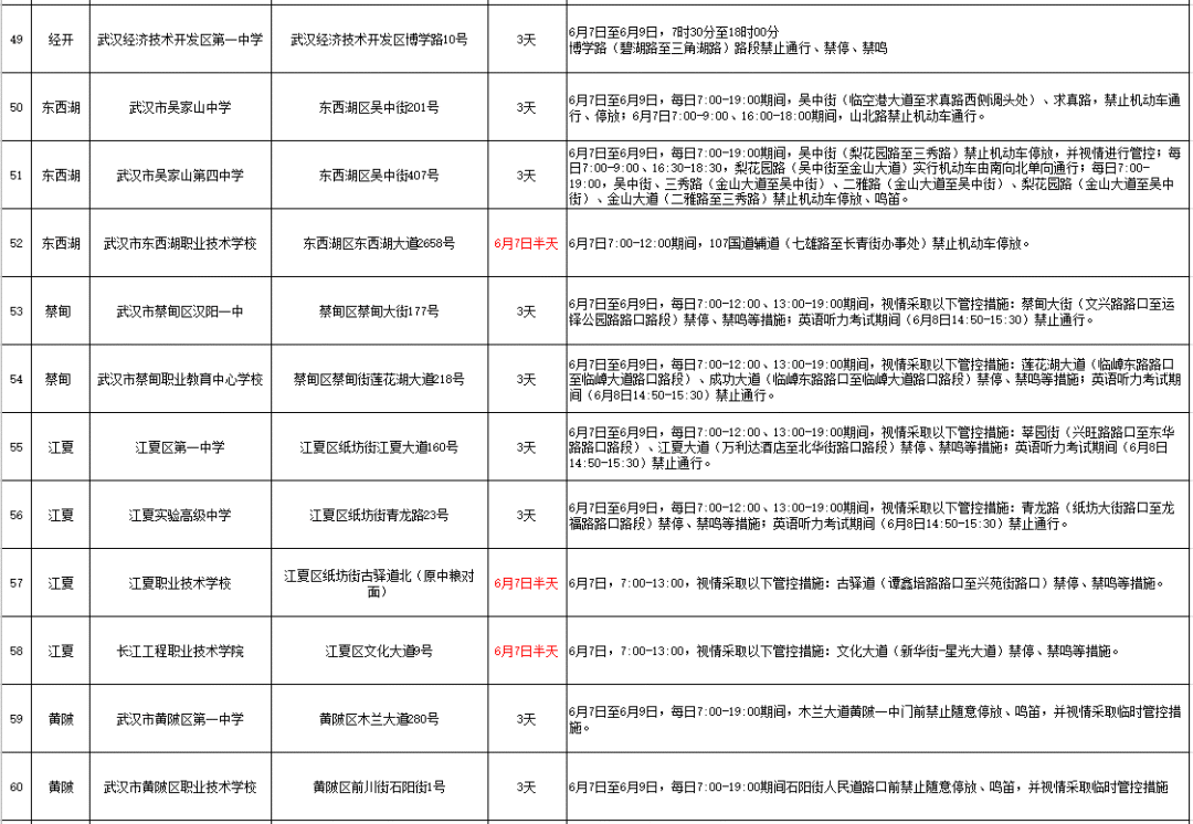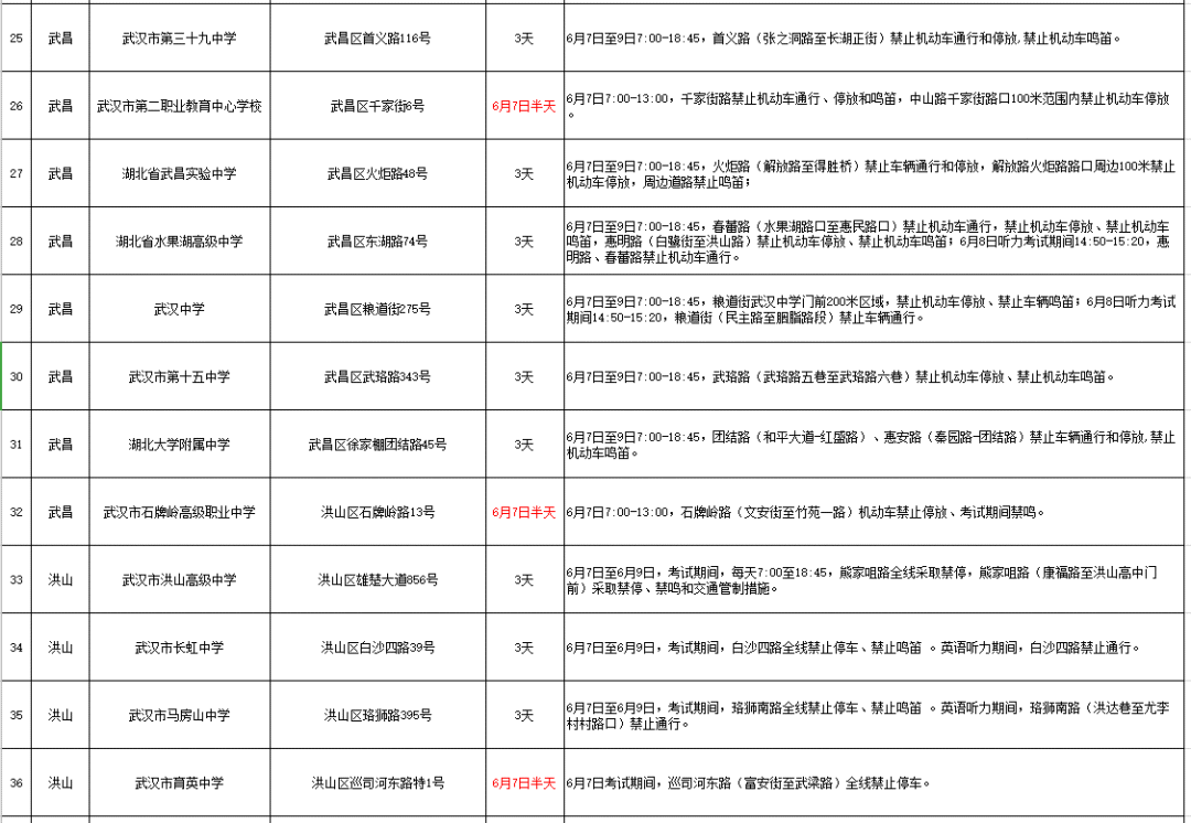 6月7日—9日每日上午考试前2小时至当日考试结束,首义路(长湖正街至张之洞路)限行。