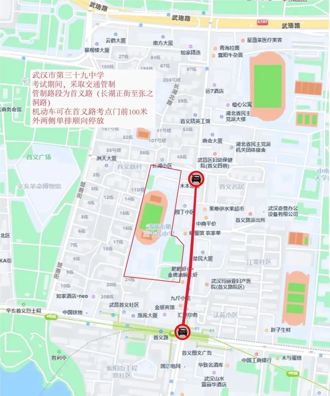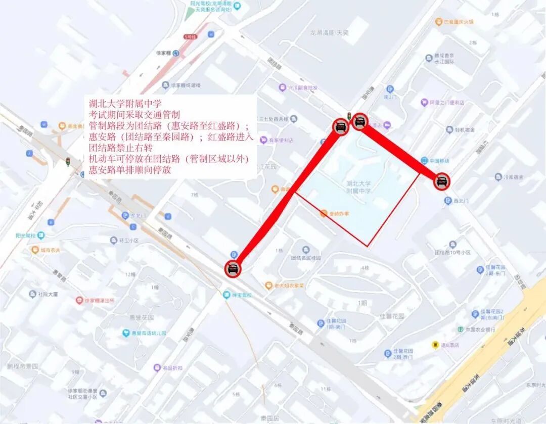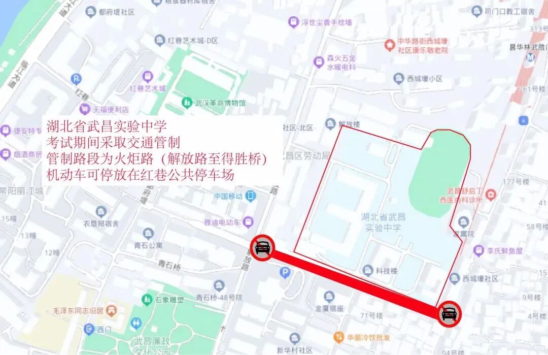 6月7日—9日每日上午考试前2小时至当日考试结束,首义路(长湖正街至张之洞路)限行。