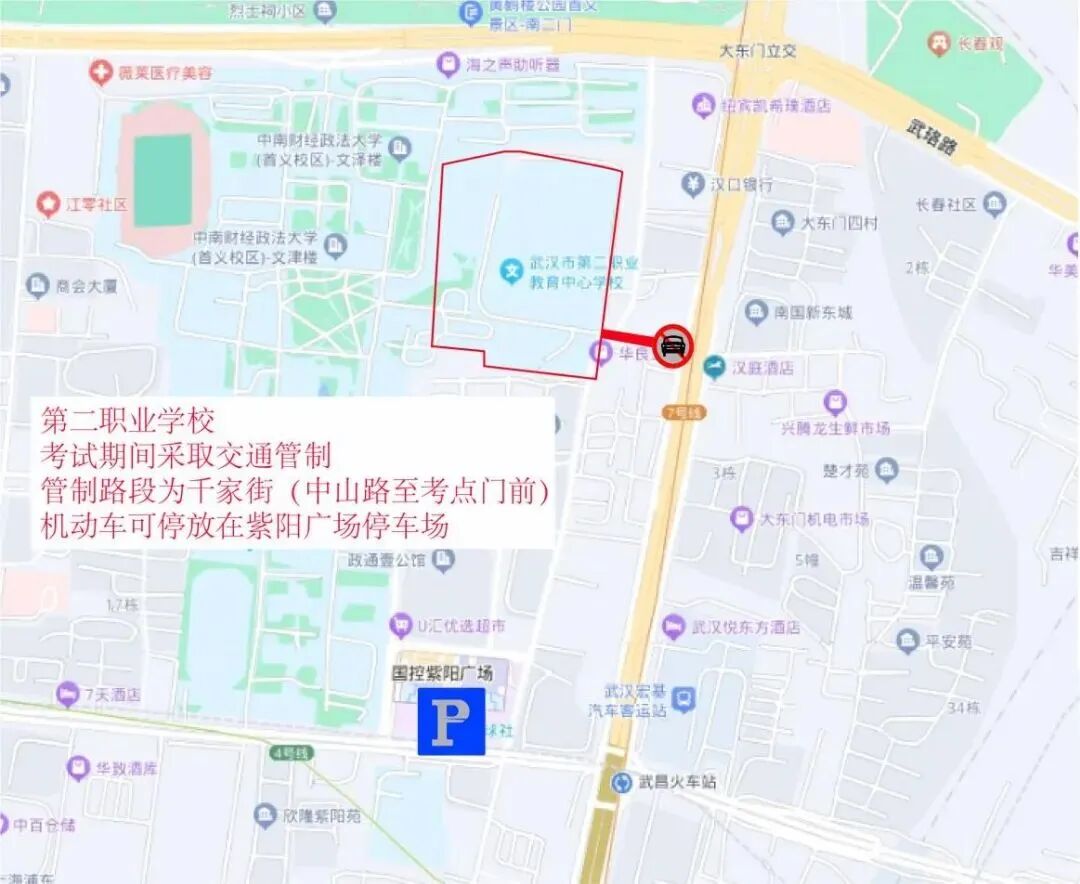 6月7日—9日每日上午考试前2小时至当日考试结束,考点门前武珞路辅道、非机动车道禁止通行。