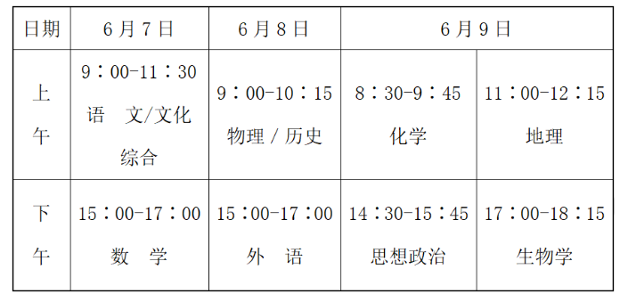 6月9日上午和下午第一场考试开考时间比前两天均提前了半小时,考生在周日也要注意,根据各自参考科目计算好路途所需时间并打足余量,避免迟到。