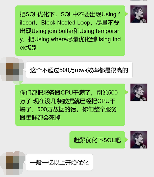 搭建技术团队一定要找靠谱的人,最起码团队的核心人员要靠谱,像我朋友团队的这个技术,在他的认知里,MySQL执行计划出现Using temporary、Using filesort、Using join buffer、Block Nested Loop,500W rows效率都很高,殊不知他们生产环境实际主表数据才10几条,要是真达到500W量级就别查询了,数据库直接就趴下了。