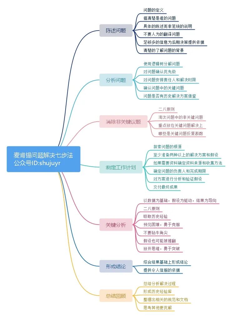 麦肯锡问题分析解决七步法还是挺有名气的,也被很多人奉为圭臬。那么麦肯锡问题解决七步法的内核逻辑是什么,我给大家画个思维导图一目了然。