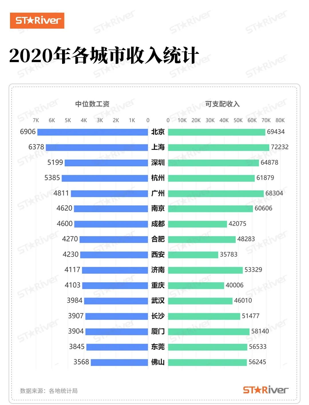 可以看到,上海的可支配收入是全国最多的。北京、广州紧随其后,全国每年可支配收入超6万元的城市只有以上6个。