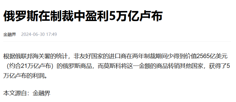 莫斯科,6月30日,俄罗斯新闻社报道,在过去两年制裁期间,不友好国家的进口商未能接收到总计价值2565亿美元(约21万亿卢布)的俄罗斯商品,而莫斯科则成功地将这部分商品转向其他国家,并实现约5万亿卢布额外利润。