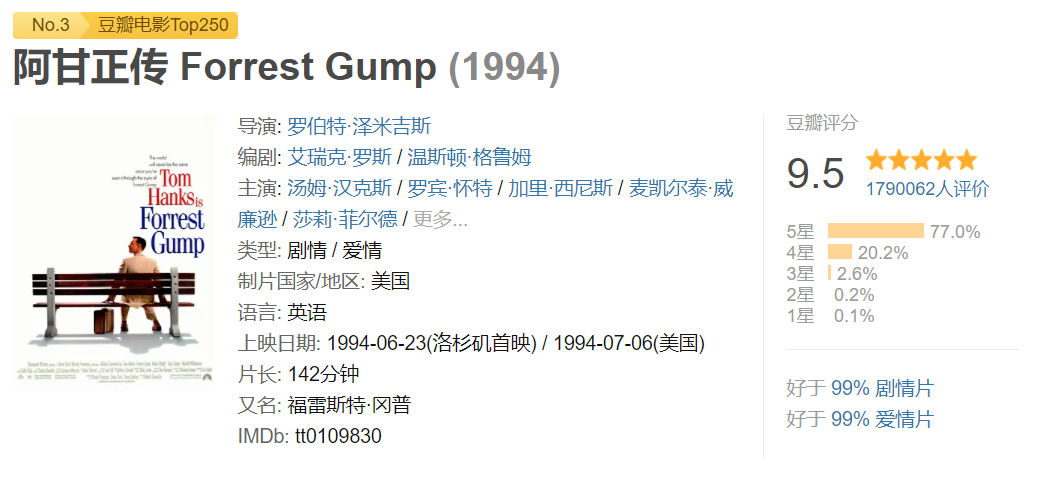 奔跑的汤姆·汉克斯,以及“人生就像一盒巧克力”的比喻,是一碗30年还热乎着的鸡汤。豆瓣评分随着时间的推移还在增长,目前已高达9.5分。