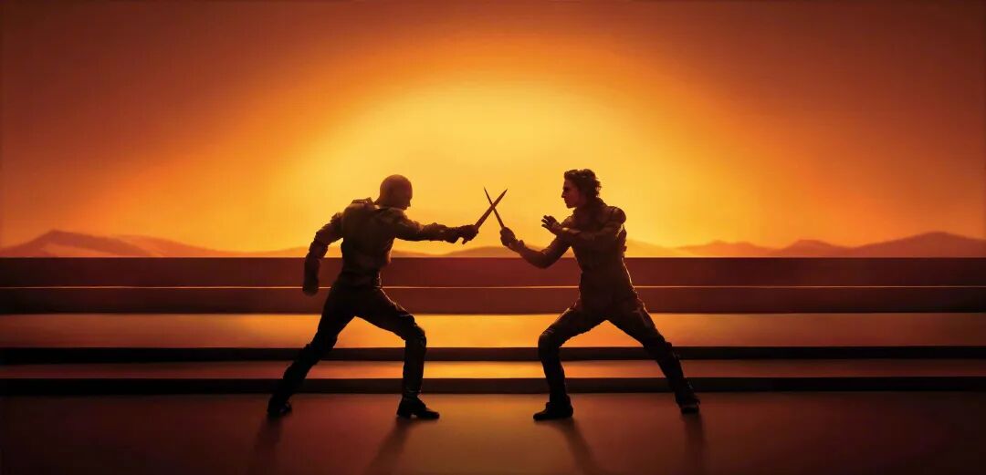 色彩方面,厄拉科斯星球是漫无边际的黄色沙海;哈克南星球是极致的黑与白,构建锋利的光影;帝国星球最似人类居住的环境,有绿树,有楼台,安逸而悠闲。将色彩、光影分成鲜明区块后,各部族之间的战斗画面呈现出简洁而雄浑的力量。