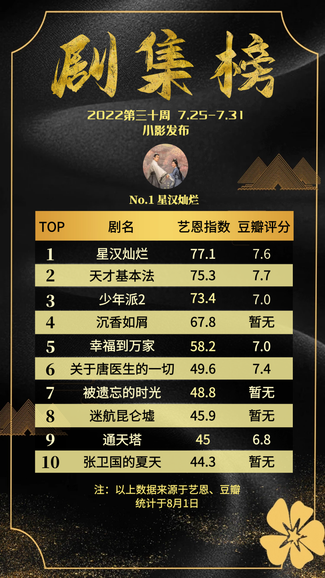 本周19部首轮剧在播,目前暑期档倾向于被年轻向剧占据。《星汉灿烂》《天才基本法》《少年派2》《沉香如屑》位居本周前四,“强流量阵容+内容年轻化”的特点显著。古偶剧《星汉灿烂》汇集吴磊、赵露思、曾黎等诸多高颜值演员,阵容养眼;杨紫搭档成毅的高成本仙侠剧《沉香如屑》,演绎绝美虐恋,两大主演演技获赞;生活剧《少年派2》首先主打了年轻向内容,除了赵今麦、郭俊辰、姜冠南继续出演原角色,还有闫妮和张嘉益贡献家庭笑点;张子枫、雷佳音、张新成等主演的《天才基本法》,再现穿越平行时空亮点。