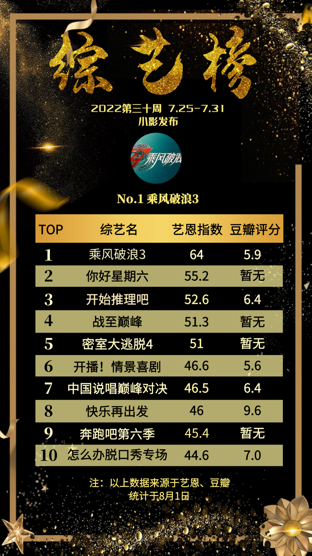 本周综艺榜变化不大,《乘风破浪3》依旧拔得头筹,《开始推理吧》《密室大逃脱》悬疑推理类真人秀热度重新回归,势头强劲。电竞类综艺《战至巅峰》稳定发挥,精准大众潜在群体。