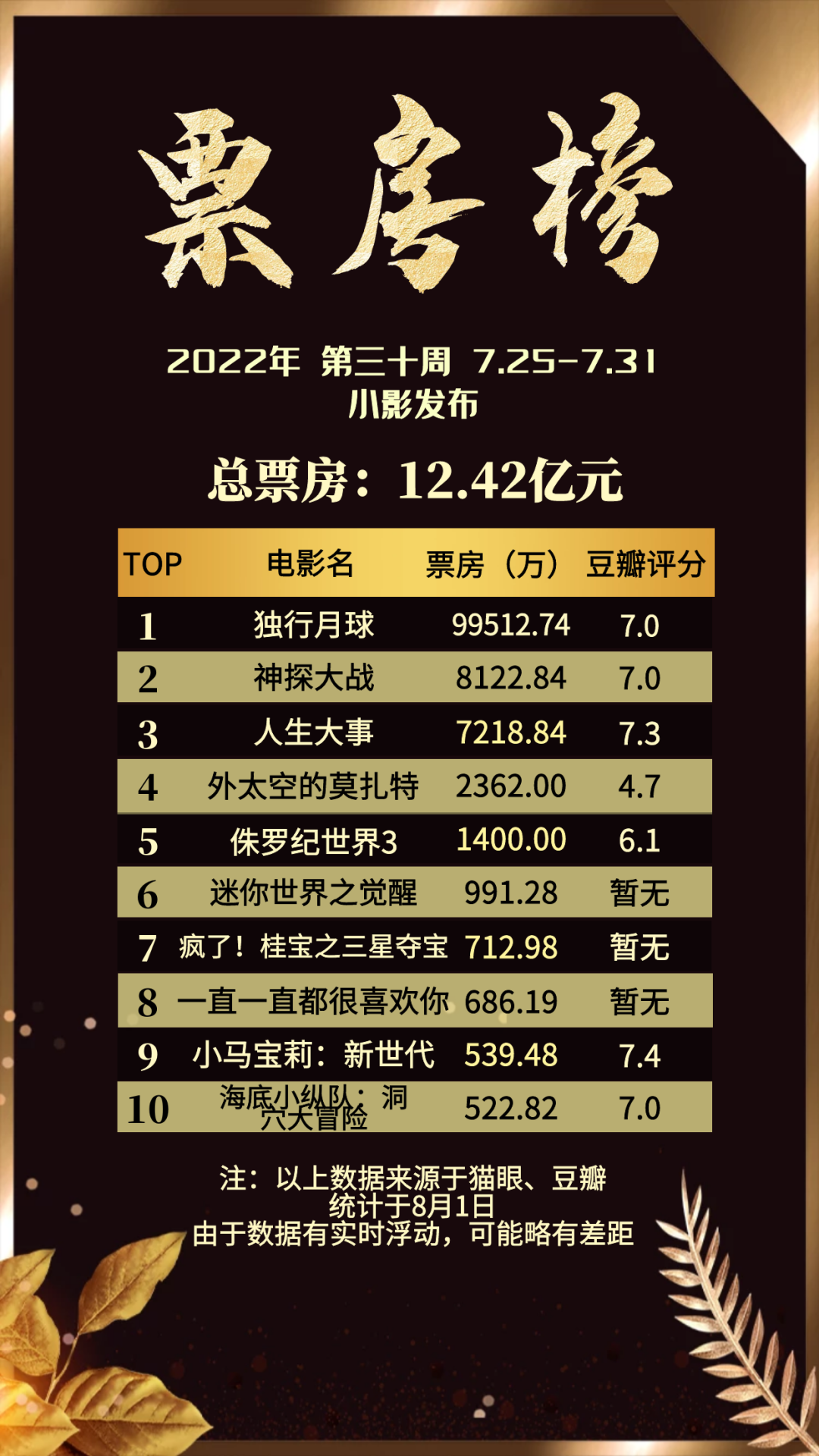 2022年第30周内地电影总票房12.42亿,环比上升140%,《独行月球》首周末票房9.95亿,贡献周末票房近九成,强势领跑市场,带动大盘创暑期新高。《神探大战》《人生大事》分别以0.81亿、0.79亿位列周票房第二、第三,《迷你世界之觉醒》《疯了!桂宝之三星夺宝》《小马宝莉:新世代》三部动画新片票房表现乏力,周末票房贡献均在2%以内。