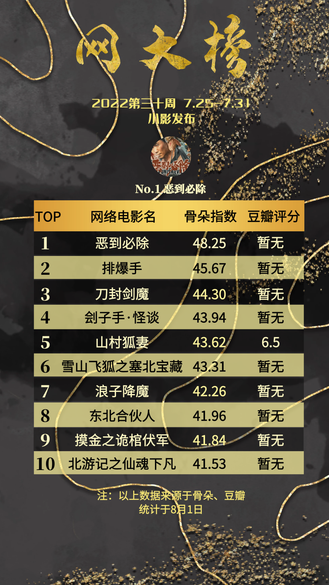 7月网络电影热度指数较上月整体有所上升,跻身前十的网络电影多集中在月中至月末上线。排名前二的《恶到必除》《排爆手》均为多平台开播的新主流影片,古装奇幻题材电影《刀剑封魔》排名第三。