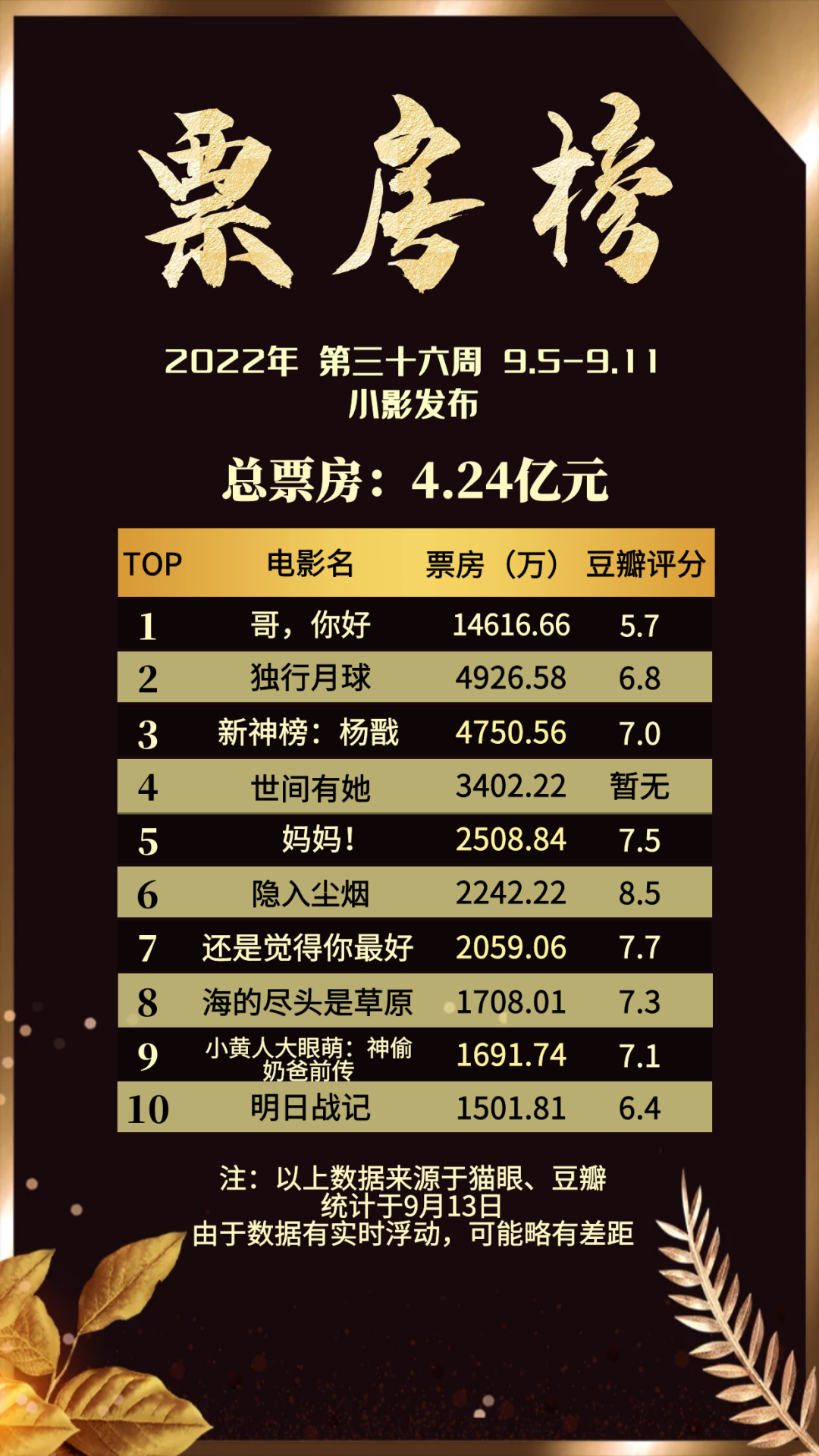 今年中秋档,有12部新片热映,据数据统计,今年中秋档总票房3.78亿元。《哥,你好》(1.44亿元)、《新神榜:杨戬》(4362万元)、《独行月球》(3929万元)、《妈妈!》(3027万元)、《世间有她》(2871万元)位列前五。其中,《哥,你好》是唯一一部档期票房过亿的影片,该片连续3天获得日票房冠军。