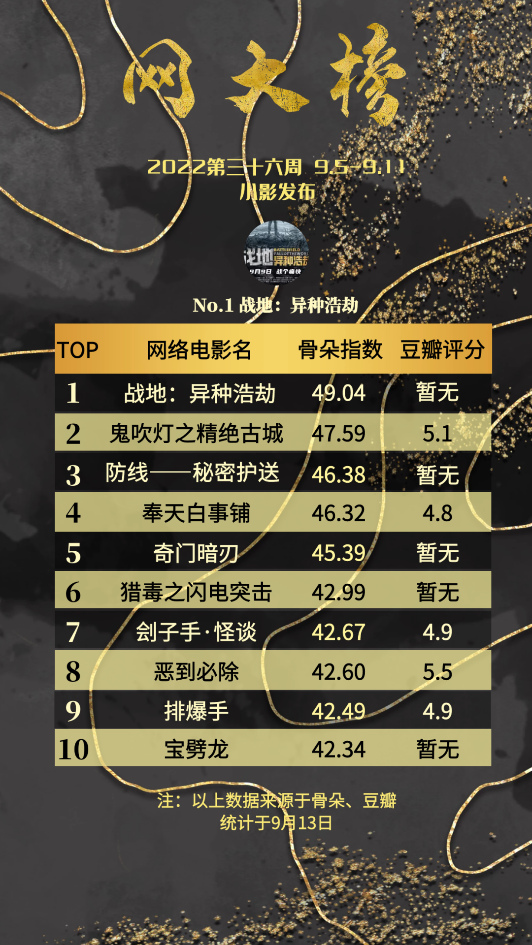 本周网大榜第一由《战地:异种浩劫》夺得,上映4天,全网热度登顶热度冠军。《鬼吹灯之精绝古城》连续两周排名榜单第二;上映6天的军旅片《防线——秘密护送》热度位列第三,民俗惊悚片《奉天白事铺》《刽子手怪谈》排名第四、第七。本周上线新片《奇门暗刃》排名第五。上周上榜的《猎毒之闪电突击》《恶到必除》《排爆手》《宝劈龙》本周依然在榜,排名有所变化。