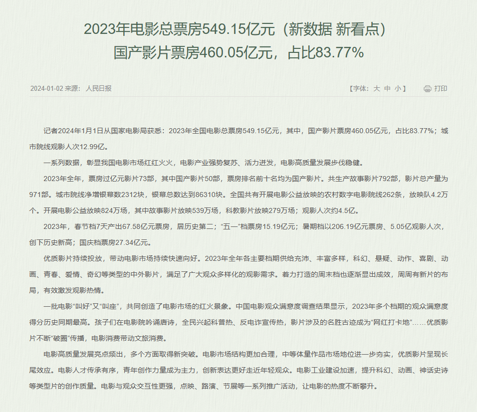 元旦刚过,国家电影局公布了2023年中国电影行业的成绩单:全年电影票房为549.15亿元,其中国产影片票房为460.05亿元。全年票房过亿元影片共73部,其中国产影片50部,票房排名前10位均为国产影片。